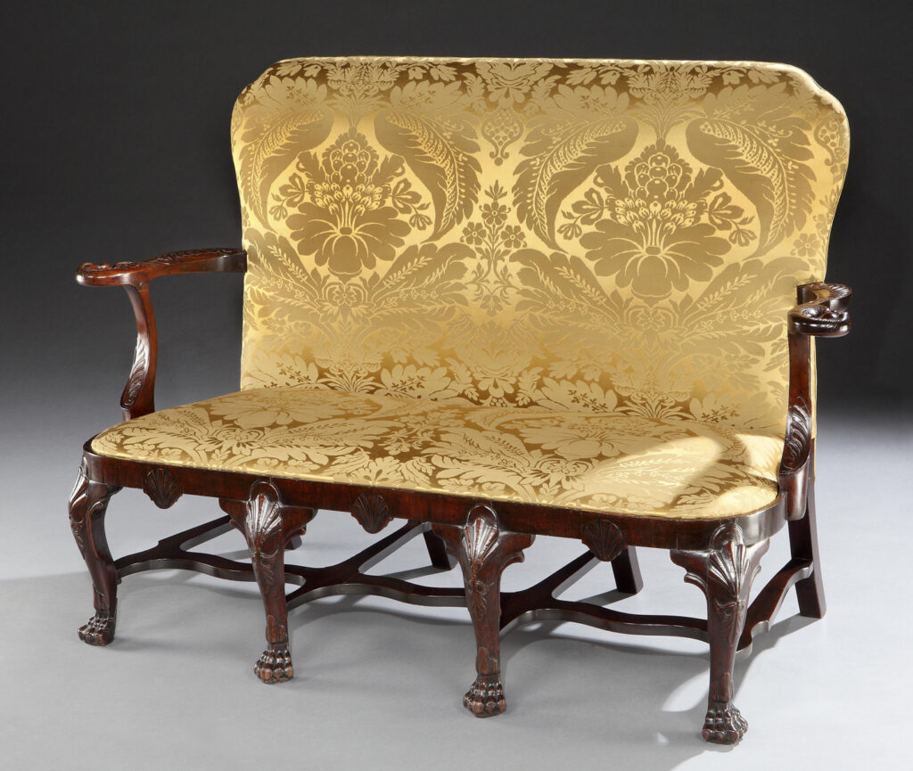 A rare and important Irish 18th century two seater sofa, the upholstered back and drop in seat with out scrolled acanthus carved arms terminating in winged beasts, the apron with carved scallop shells on eight legs joined by a flat stretcher, the front four cabriole legs with scallop shells with trailing acanthus to the knees and terminating in paw feet with carved hocks.
