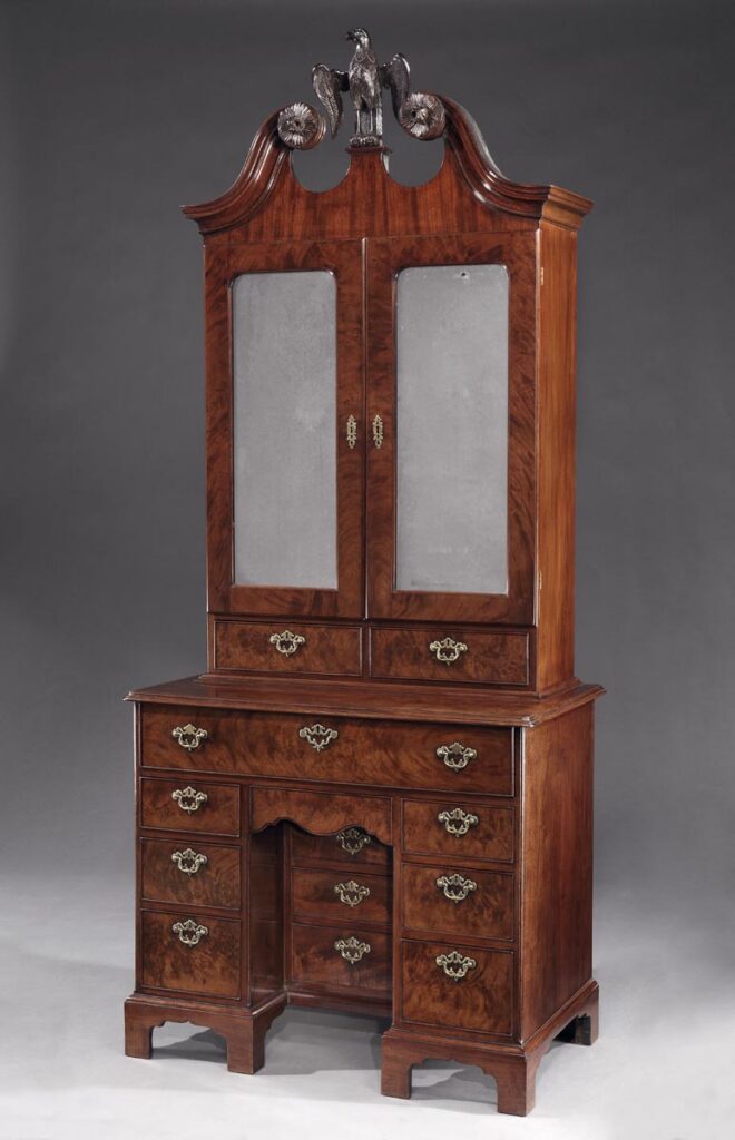 On 8 December 1764 Lady Elizabeth Cobbe recorded in her account book a payment of £11 17s 6d for a ‘Bureau with Glass Doors’. This is undoubtedly the handsome mahogany secretaire-cabinet (fig.163), attributable again to Christopher Hearn, with a palladian scrolled pediment centered by an eagle, now in the back drawing-room at Newbridge. Probably originally made for a bedroom apartment it would have combined the uses of clothes- chest, writing-bureau, dressing-table and cabinet for books and documents, whist its mirrored doors would have served as a pier glass.