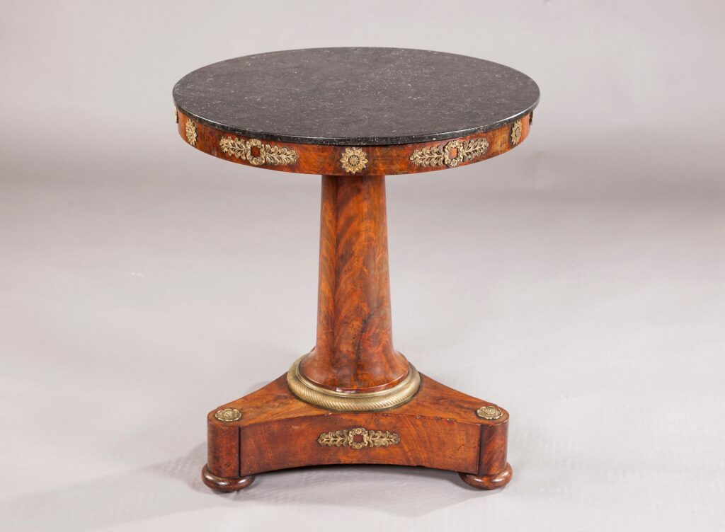 A stylish figured mahogany French Gueridon, the original fossil limestone top resting on an ormolu mounted frieze, above a smart cylindrical column, to a plate-form base with a circular ormolu ring and original ormolu mounts.