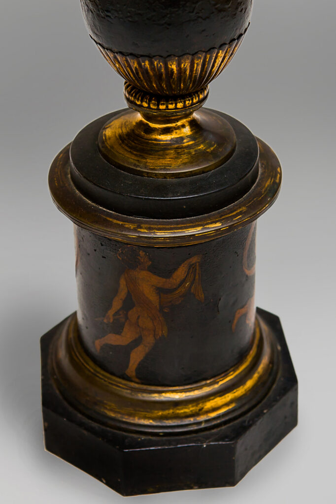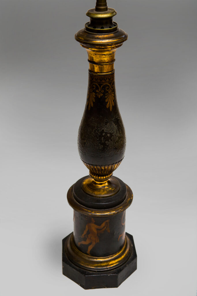 A Pair of 19th century Tole ware and brass lamps with dancing nymphs.