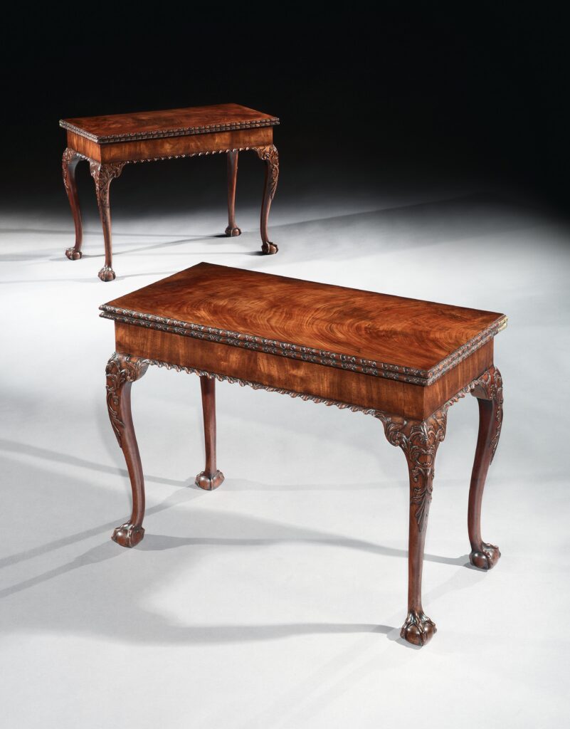 The superbly figured rectangular mahogany book matched tops, carved with a floral patria edge on a punched background, above a plain frieze with a carved gadrooned edge, resting on elegantly carver cabriole legs, with ball and claw feet, retaining wonderful original colour and patina.